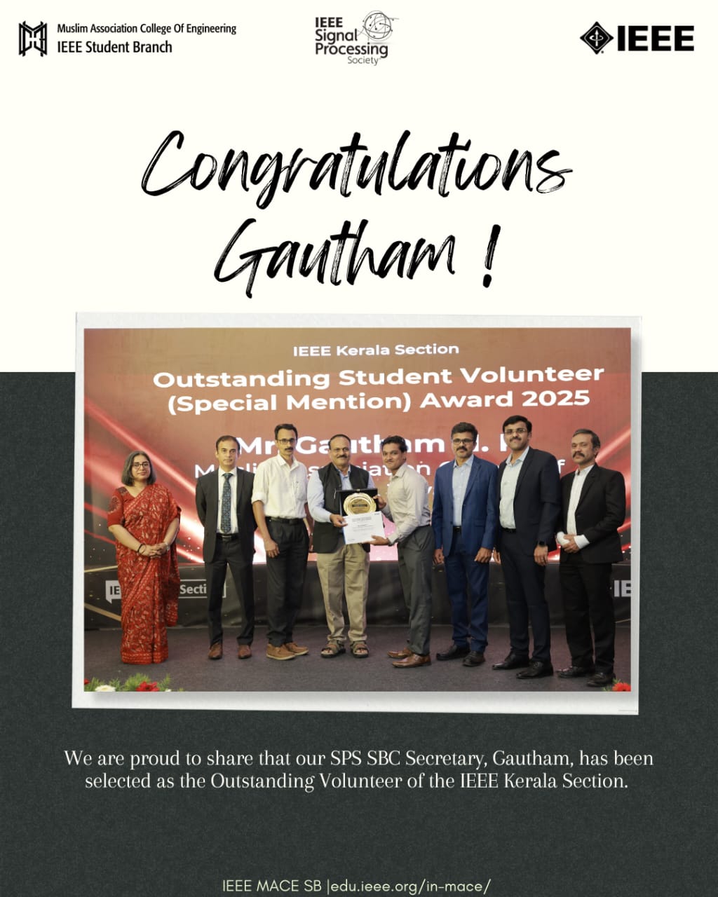 We are proud to celebrate remarkable achievement of our *SPS SBC Secretary, Gautham* , on being recognized as the *Outstanding Student Volunteer* by the *IEEE Kerala Section.* This honor reflects his dedication, leadership, and consistent contributions to IEEE activities. Wishing him many more milestones ahead! *IEEE MACE SB*