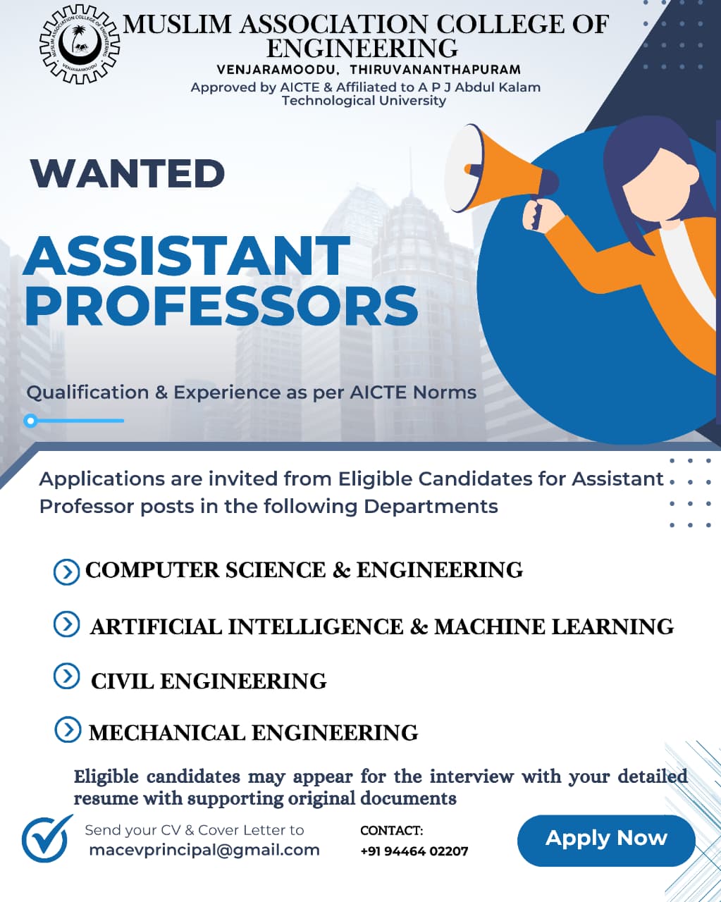 Read MoreMuslim Association College of Engineering (MACE) will have a transformative impact on society through continual innovation in education, research, creativity and entrepreneurship.It will meet the global competitive expectations of a rapidly changing technology driven society and mould a generation of innovative leaders with commitment and confidence.