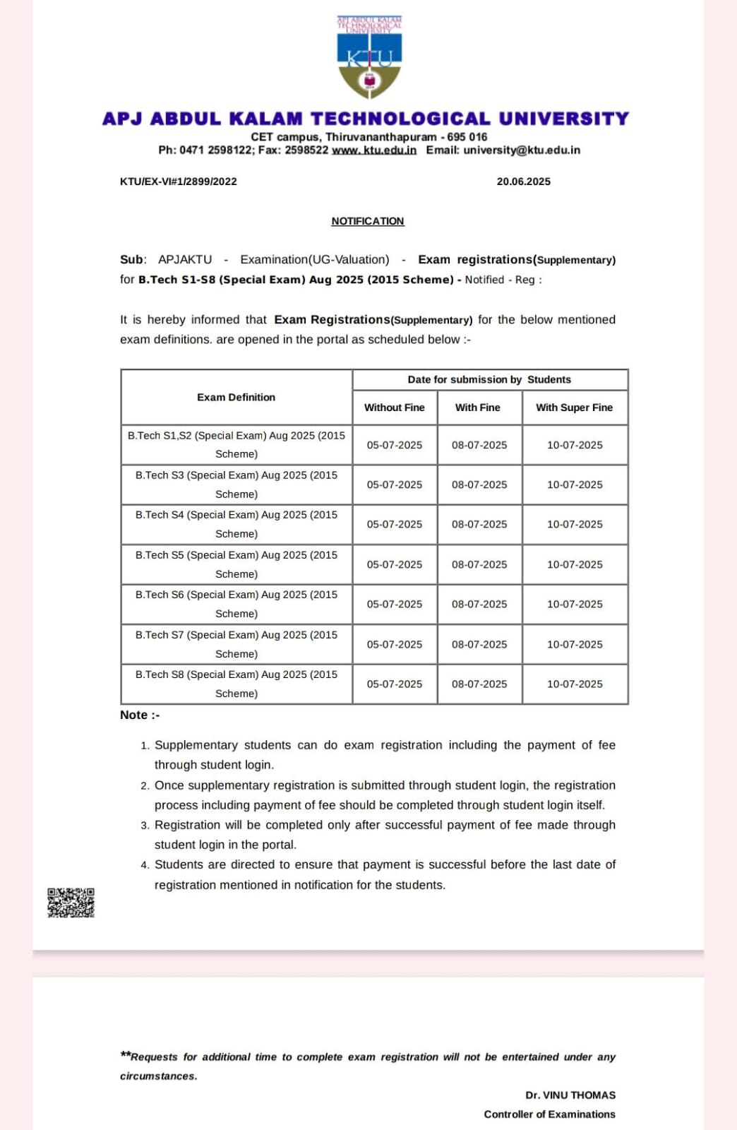 APJ Abdul Kalam Technical University Examination Notice Supplementary Exam Registrations for B.Tech S1-S8 (Special Exam) Aug 2025 Students are...