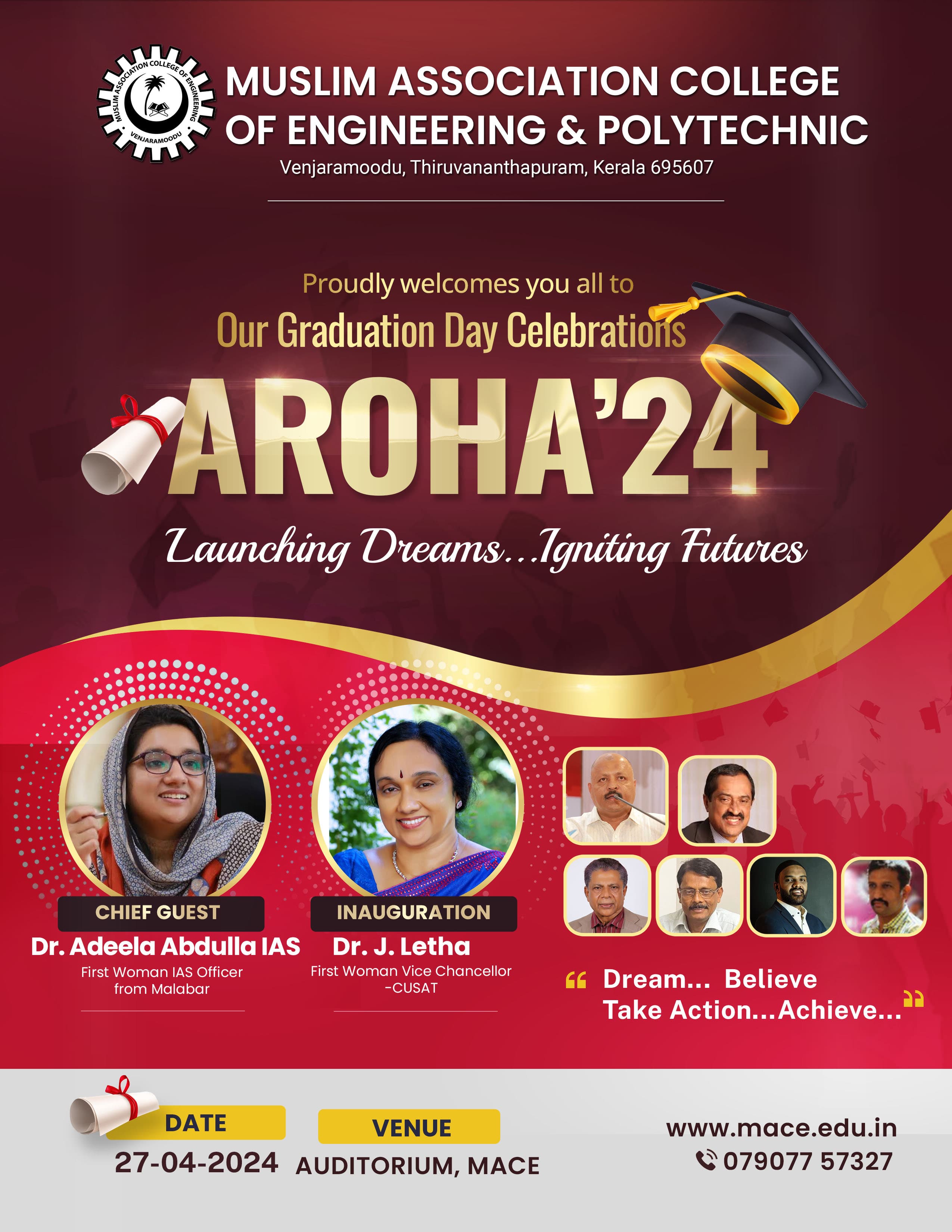 MACE extends a warm invitation to all for our Graduation Day celebration, ‘AROHA’24: Launching Dreams… Igniting Futures,’ scheduled for April 27, 2024, at the MACE auditorium. Our distinguished Chief Guest for the occasion is Dr. Adeela Abdulla IAS, First woman IAS officer from Malabar and ceremony will be inaugurated by Dr. J. Letha, the First Woman Vice Chancellor of CUSAT.