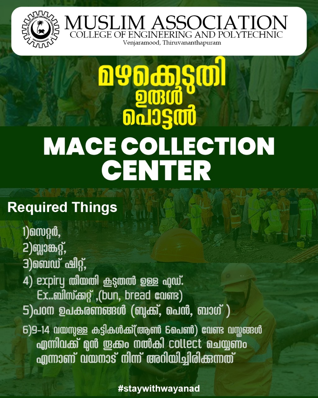 We are here to listen, to help and to support the people of Wayanad landslide disaster.Our campus has declared as collection center for emergency things for the people in Wayanad. Required things are: 1.Sweater 2.Blankets 3.Bedsheets 4.Food items which are not easily spoiled 5.Study materials like books,pencils, pen 6.Dress materials 7.First aid things 8.Emergency lights etc...... #staywithwayanad