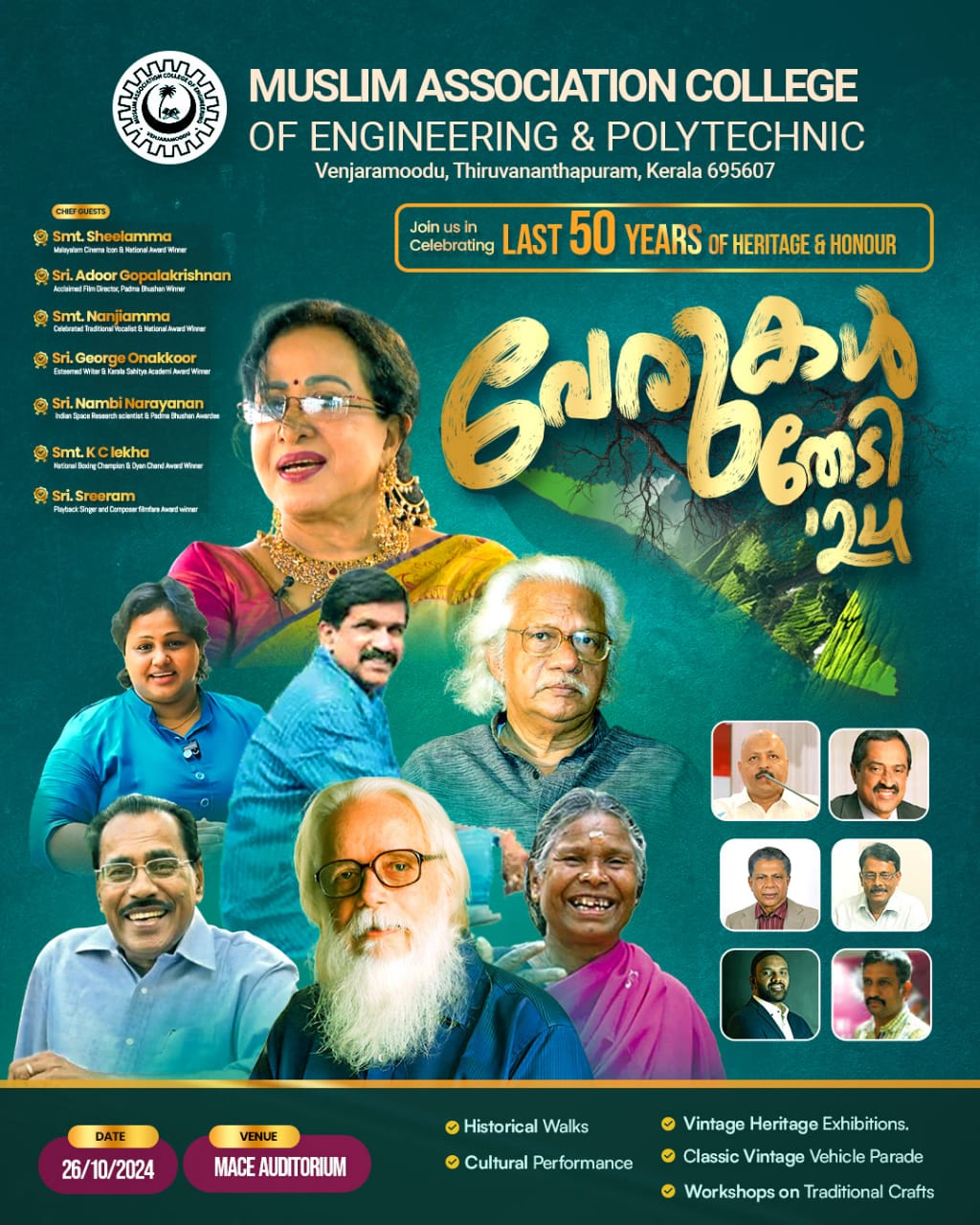 "Step back in time and join us for a Vintage Day celebration".......Vintage day is atribute to the timeless beauty of the past, its culture and its people... Date:26/10/2024 Venue:College Campus Guests: Smt Sheelamma,Malayalam Cinema Icon Sri.Adoor Gopalakrishnan, Film Director Sri.NambiNarayanan,Scientist Sri.George Onakkoor, writer Smt.Nanjiamma, traditional Vocalist Sri.Sreeram,playback singer and composer Smt.K C Lekha, National Boxing Champion