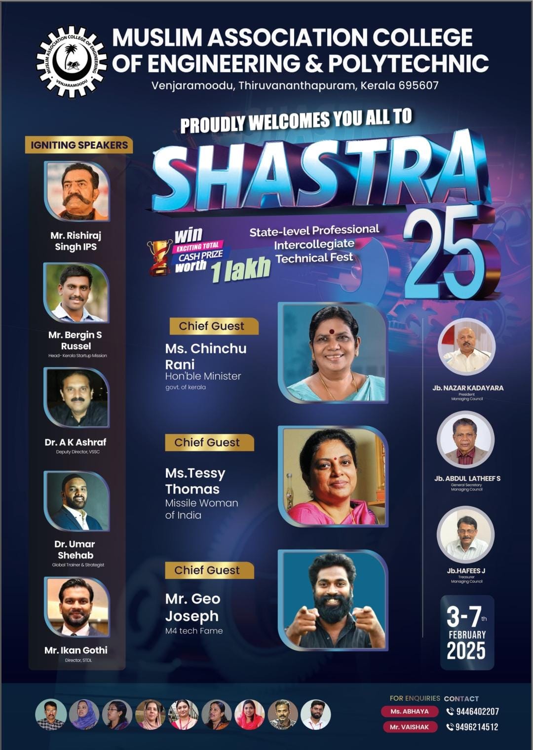 MACE team are trilled to announce the the dates of our Technical Fest SHASTHRA 2k25, scheduled to take place on 4th and 5th February 2025 at MACE Campus..........